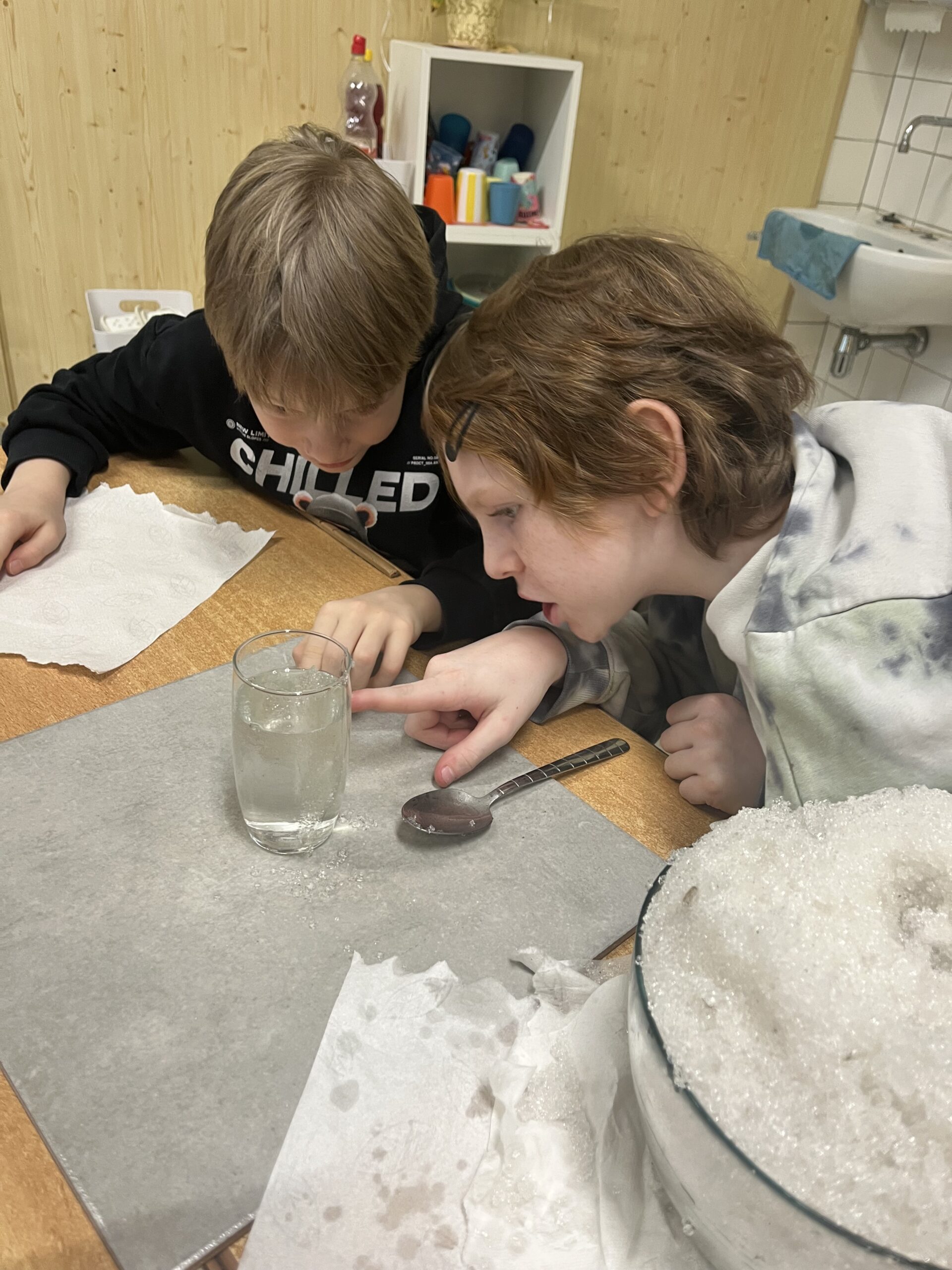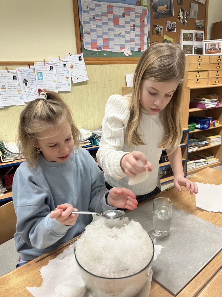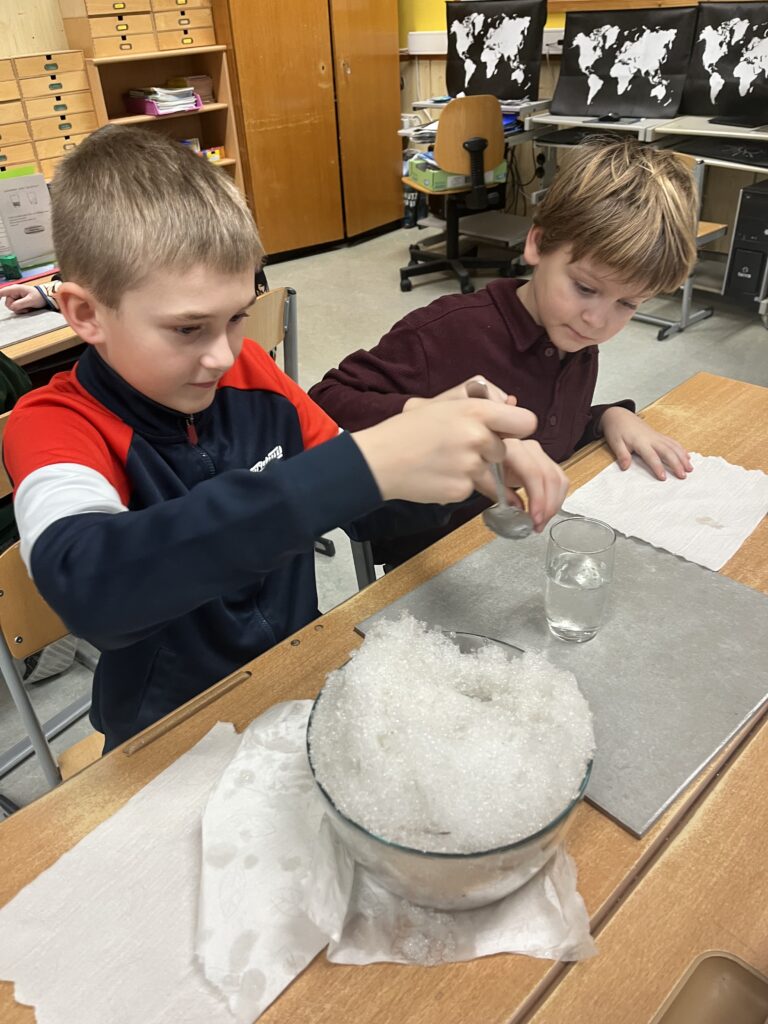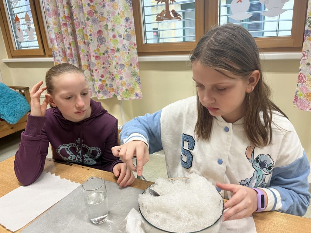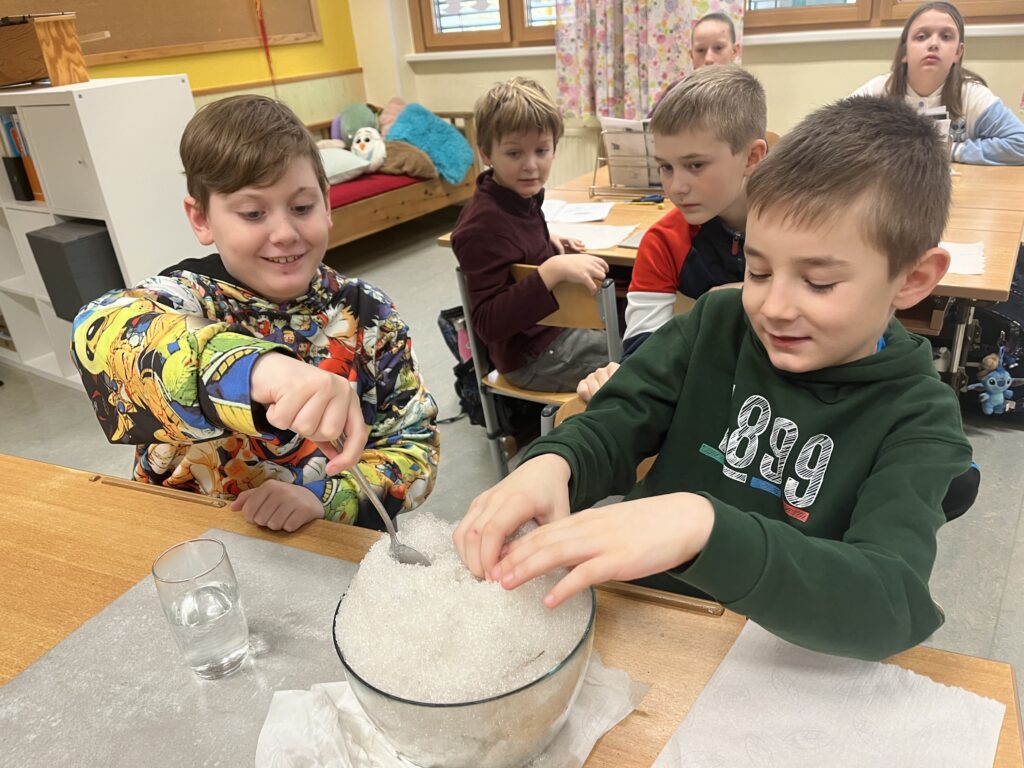 Die Schüler:innen der 3. und 4. Schulstufe beschäftigten sich im Sachunterricht mit dem Thema Schnee und Eis und erforschten die Aggregatzustände von Wasser. In Experimenten untersuchten sie, welche Formen Wasser annehmen kann und was passiert, wenn Schnee in Wasser gegeben wird. Außerdem gingen die Kinder der Frage nach, wie Schneeflocken entstehen, verglichen Schnee und Eis hinsichtlich Gewicht und Dichte und fanden heraus, was schwerer oder leichter ist. Durch das praktische Experimentieren konnten naturwissenschaftliche Zusammenhänge anschaulich und mit viel Freude entdeckt werden.