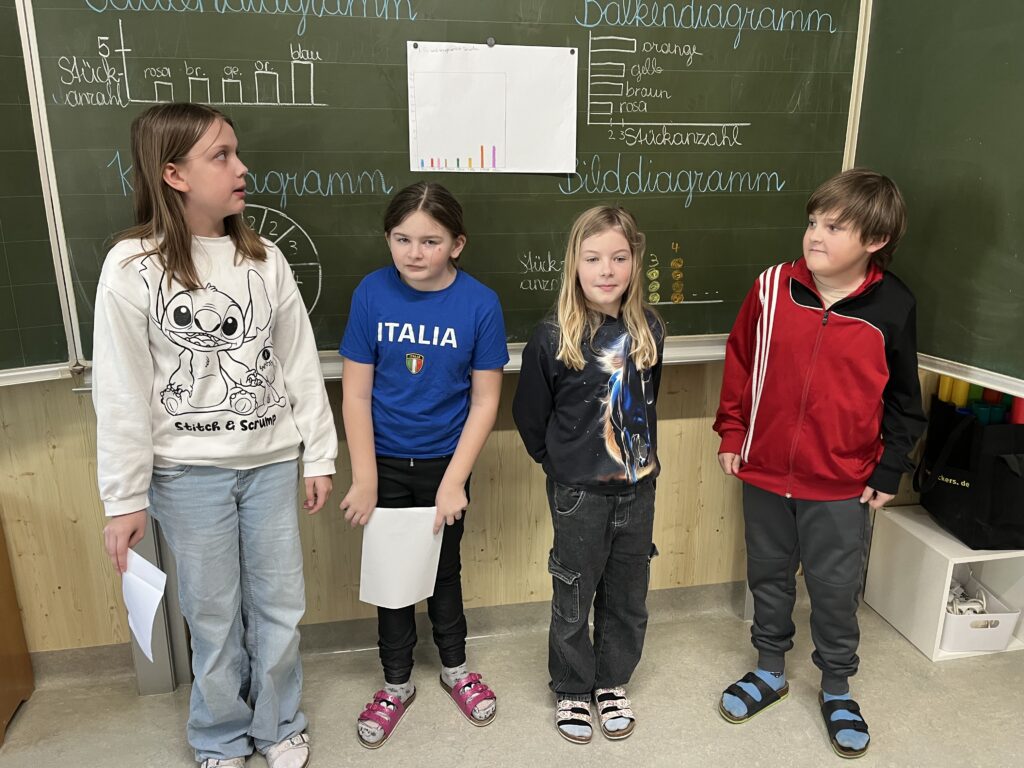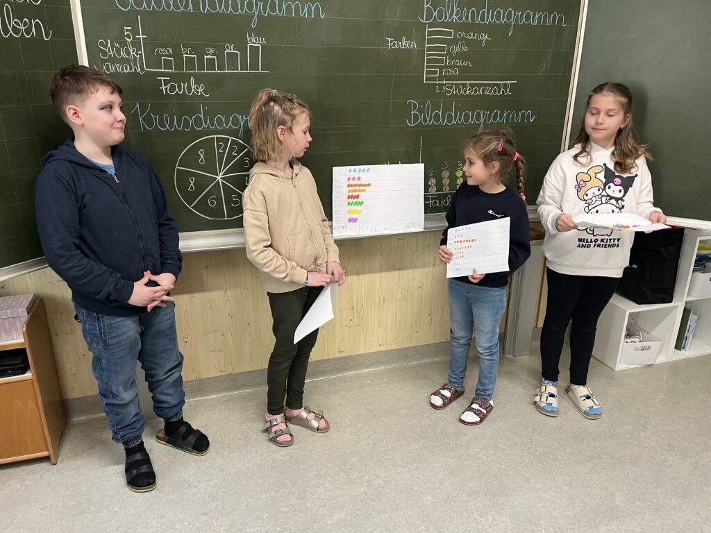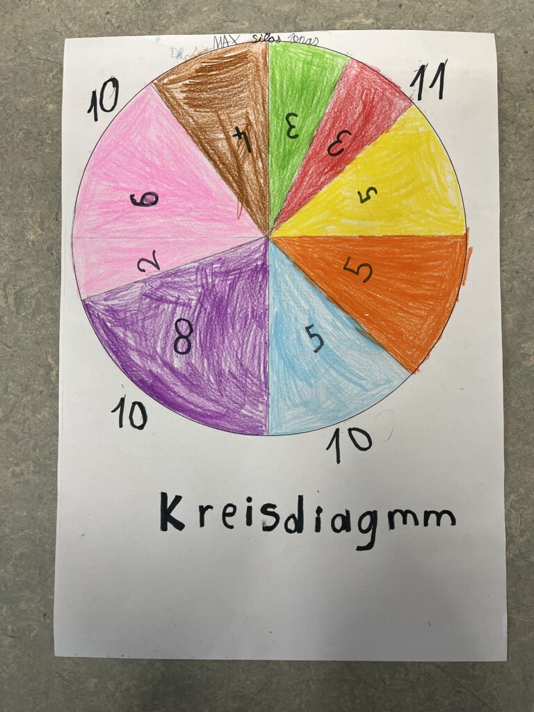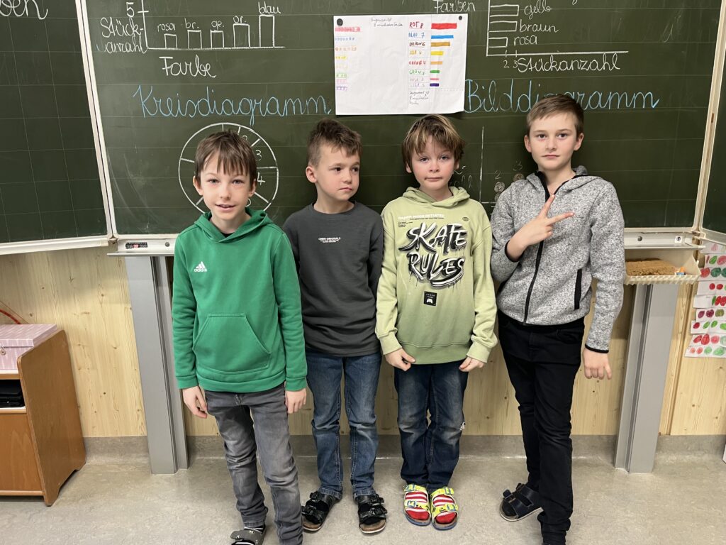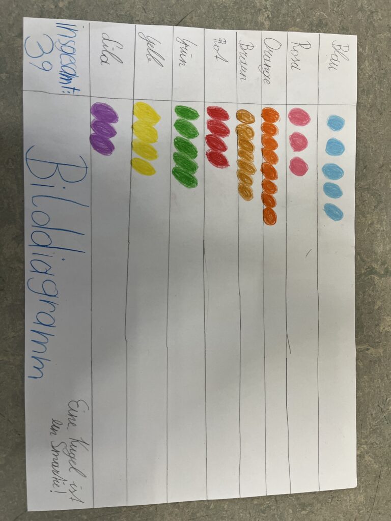 Im Mathematikunterricht beschäftigten sich die Schüler:innen der 3. und 4. Schulstufe mit Tabellen und Diagrammen. Um das Thema praktisch zu vertiefen, arbeiteten die Kinder in Kleingruppen und erstellten eigene Diagramme. Dafür wurde eine Packung Smarties genau unter die Lupe genommen. Die Schüler:innen sortierten, zählten und hielten ihre Ergebnisse in Tabellen fest. Anschließend stellten die Schüler:innen die Ergebnisse in verschiedenen Diagrammen dar und zeichneten diese. Zum Abschluss präsentierten die Gruppen ihre Ergebnisse den Schüler:innen der Klasse. Die Ergebnisse können sich sehen lassen!