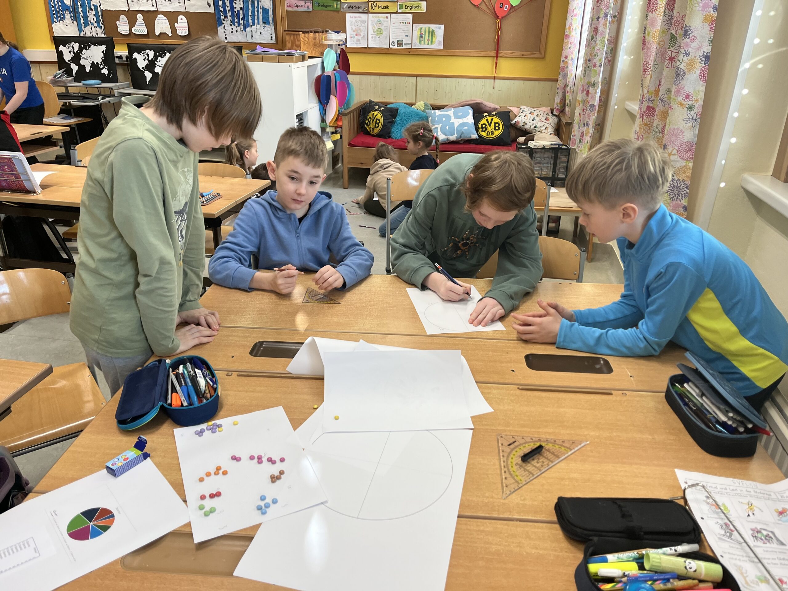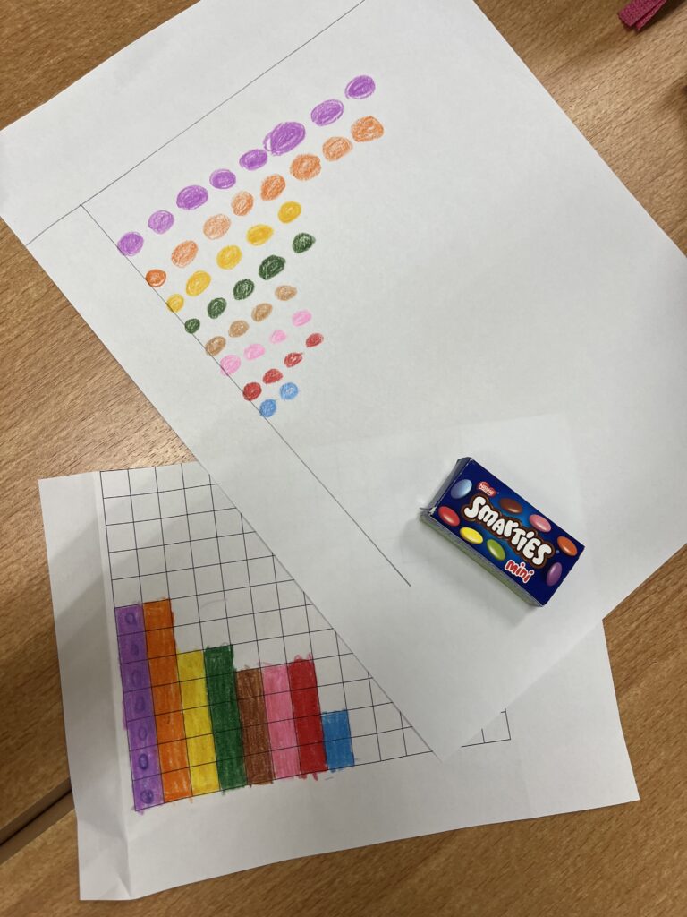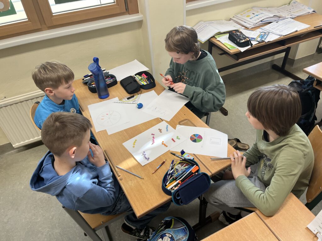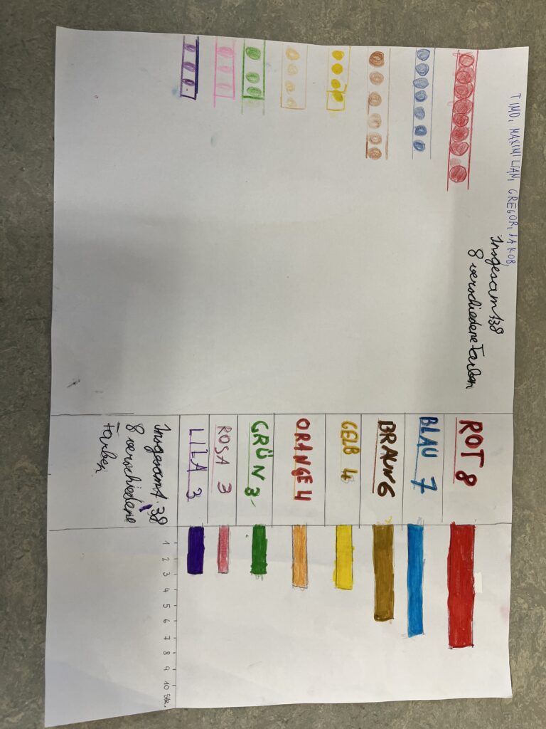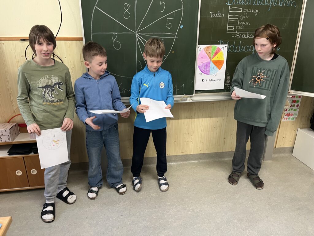 Im Mathematikunterricht beschäftigten sich die Schüler:innen der 3. und 4. Schulstufe mit Tabellen und Diagrammen. Um das Thema praktisch zu vertiefen, arbeiteten die Kinder in Kleingruppen und erstellten eigene Diagramme. Dafür wurde eine Packung Smarties genau unter die Lupe genommen. Die Schüler:innen sortierten, zählten und hielten ihre Ergebnisse in Tabellen fest. Anschließend stellten die Schüler:innen die Ergebnisse in verschiedenen Diagrammen dar und zeichneten diese. Zum Abschluss präsentierten die Gruppen ihre Ergebnisse den Schüler:innen der Klasse. Die Ergebnisse können sich sehen lassen!